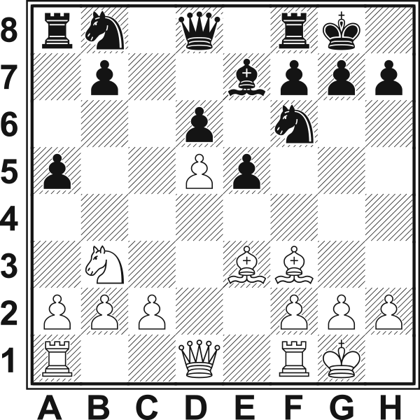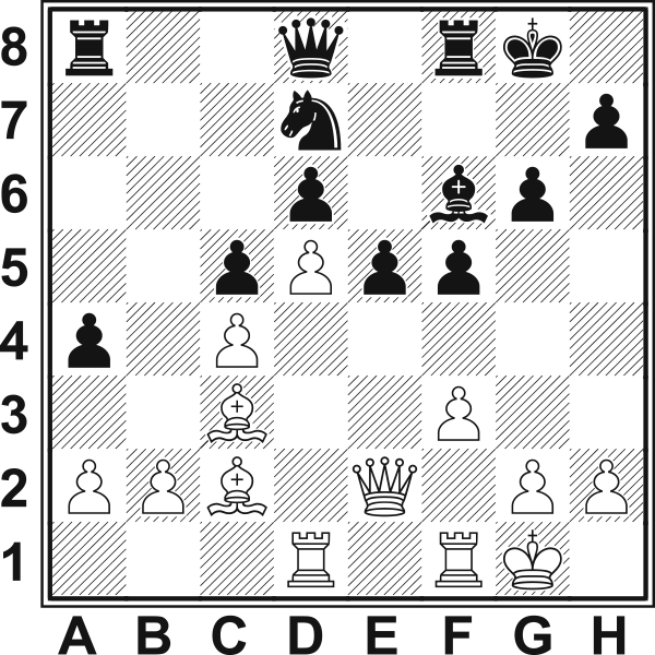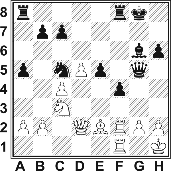 13.c4? Lepsze było13.Hd2, 13.a4 lub 13.Hd3. Teraz czarne bez trudu blokują skrzydło hetmańskie, a inicjatywa na skrzydle królewskim należeć będzie do nich. 13...Sa6 14.Gd2 b6 15.Gc3 Sc5 16.Sc5 bc5 17.He1 Sd7 18.Gd1 a4 19.Gc2 f5 20.Wd1 Pasywna gra prędzej czy później doprowadzi do przegranej. Ostatnią szansą na zaostrzenie pozycji było 20.f4 e4 21.g4 Gf6 22.gf5 We8!. 20...g6 21.He2 Gf6 22.f3