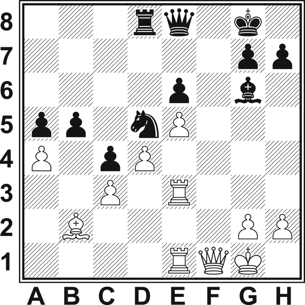 25...We6! Za jakość czarne zatrzymują białe pionki, a skoczek na d5 jest bardzo silną figurą. 26.a4 Lepsze 26.h4 z dalszym h4-h5 i Wg3, ale Reshevsky, wytrącony z równowagi zmianą rytmu gry po ofierze jakości, nie zagrał najsilniej. 26...Se727.Ge6 fe6 28.Hf1 28.Hf2 Sd5 29.Wf3 b4 28...Sd5