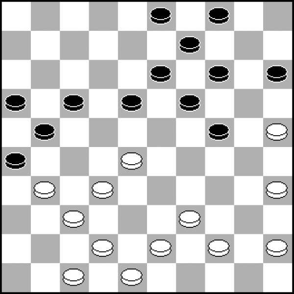 Czarne zbudowały podkowę (21, 17, 18, 19, 24), chcąc podchwycić białego piona 28. To czas, by odrzucić je do tyłu i przejąć białymi kontrolę nad centrum i punktem 24. 1.34-29! 18-22 2.29x20 25x14 3.35-30! Koniec podchwycenia, czas na atak! 3...1-6 4.45-40! Pion 45, stając na 29, będzie nie do ruszenia dla przeciwnika. 4...13-18 5.40-34 6-11 6.34-2 11-16 7.30-25 9-13 8.43-39 3-9 9.49-44 22-27 10.44-40 18-23 10...17-22? 11.26x17 22x11 12.32x21 16x27 13.28-23 19x28 14.33x31 z pionem zysku. 11.29x18 13x22 12.39-34 2-8 13.34-29 8-13 14.40-35 13-18