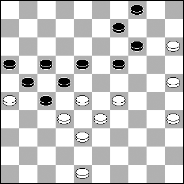 W niemałe tarapaty wpadłem już w pierwszej rundzie mistrzostw, kiedy to byłem rozstawiony. W widocznej pozycji skończyły mi się dobre opcje, pozostało szukać remisu. A ten można uratować nawet z pionem mniej − nie można się poddawać! 1.40-35 29-33 2.38x29 12-18 3.35x24 18x47 4.29-23 47x20 5.15x24 8-12 6.23-19 21-26 7.19x8 12x3 8.24-19 i powstała pozycja jest remisowa, zachęcam do samodzielnego sprawdzenia.