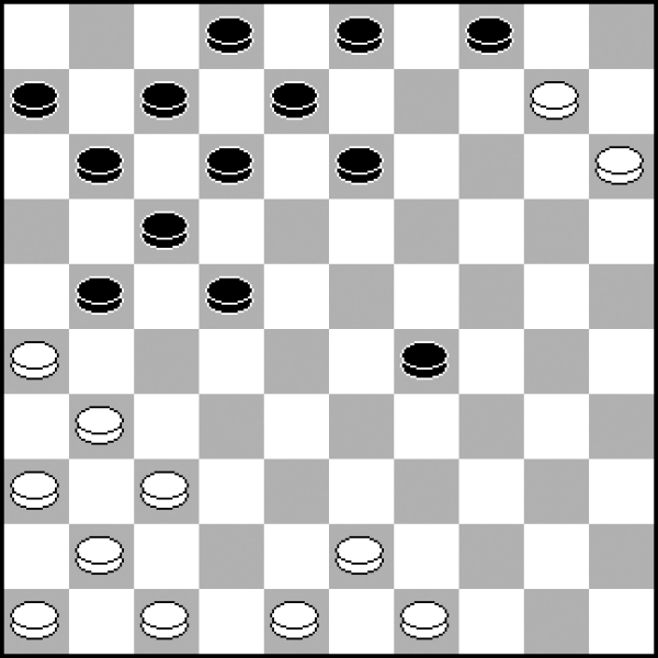 Taka pozycja powstała w końcówce. A w niej bardzo ciekawe idee. 1...32-37? Zaskakująco − remisowy ruch! Spokojnie wygrywało: 1...11-17 2.29-24 14-19 3.25-20 13-18 4.24x13 18x9. 2.42x31 27x36 3.26-21?! Dobrze kombinowałem, ale niedokładnie. Choć i tak z sukcesem. (Do forsownego remisu prowadziło efektowne: 3.29-24! 14-19 4.26-21! 13-18 5.24x13 18x9 6.21-17! 11-16 7.17x28 36-41 8.28-23 9-14 9.23-18=). 3...36-41 4.21-17 11-16 5.17x28 41-47? Kiedy przeciwnik złapał za damkę, wiedziałem, że uratowałem remis. 6.28-23! Ale po moim kolejnym ruchu skończył mu się czas i szczęśliwie wygrałem.