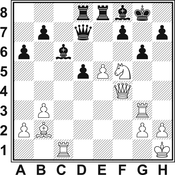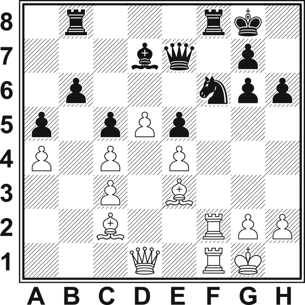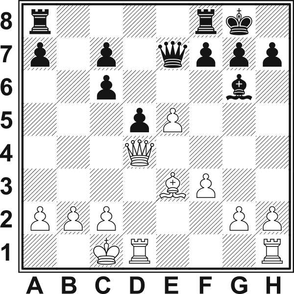 16.b3! 16.Ge3 Gb4!-+ 16...Hc7 17.Gb2 Gc6 17...Wc8 18.f5! z atakiem. 18.Wc1 Wd8 18...Ge7 19.f5! 19.Hf2! Ge7 19...d4 20.Se2! Idealnym polem dla blokady jest d4 i tam też zmierza biały skoczek. 20.Se2 0–0 21.Sd4 Hd7 22.f5 ef5 22...Gg5 23.f6± 23.Wg3! 23.Sf5 d4! 24.Wd4 He6 23...g6 23...Gh4? 24.Wg7+! Kg7 25.Hh4+– 24.Hf4! Z groźbą Hh6 i Wh3+–. 24...Wfe8 25.Sf5 Grozi Sh6. 25...Gf8