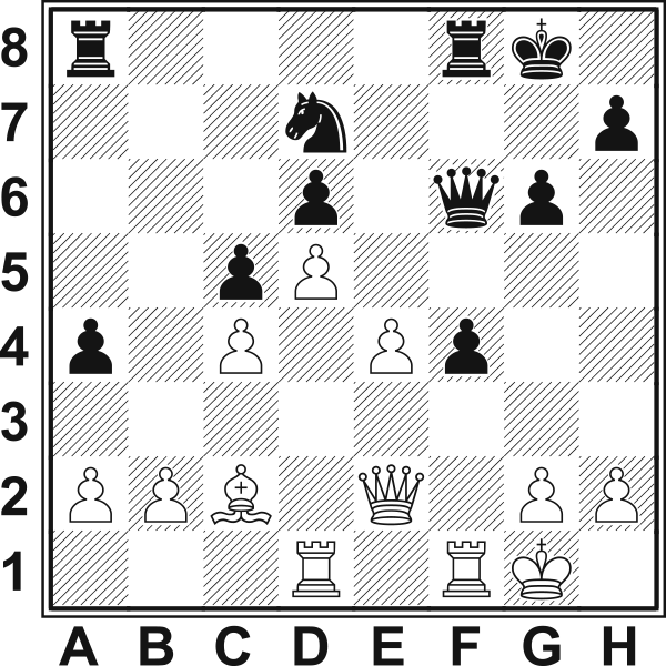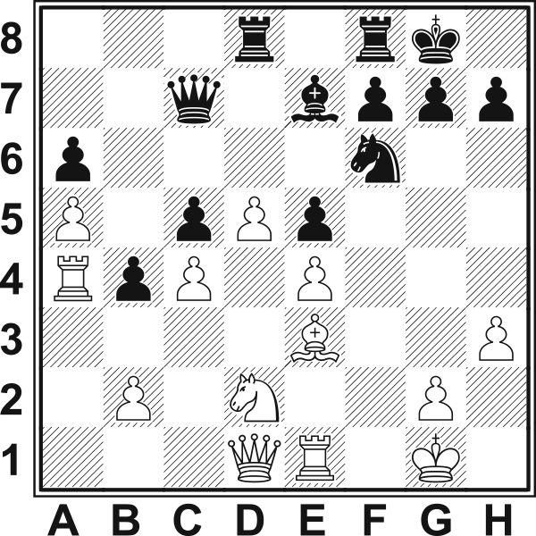 13.c4? Lepsze było13.Hd2, 13.a4 lub 13.Hd3. Teraz czarne bez trudu blokują skrzydło hetmańskie, a inicjatywa na skrzydle królewskim należeć będzie do nich. 13...Sa6 14.Gd2 b6 15.Gc3 Sc5 16.Sc5 bc5 17.He1 Sd7 18.Gd1 a4 19.Gc2 f5 20.Wd1 Pasywna gra prędzej czy później doprowadzi do przegranej. Ostatnią szansą na zaostrzenie pozycji było 20.f4 e4 21.g4 Gf6 22.gf5 We8!. 20...g6 21.He2 Gf6 22.f3