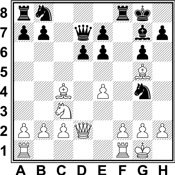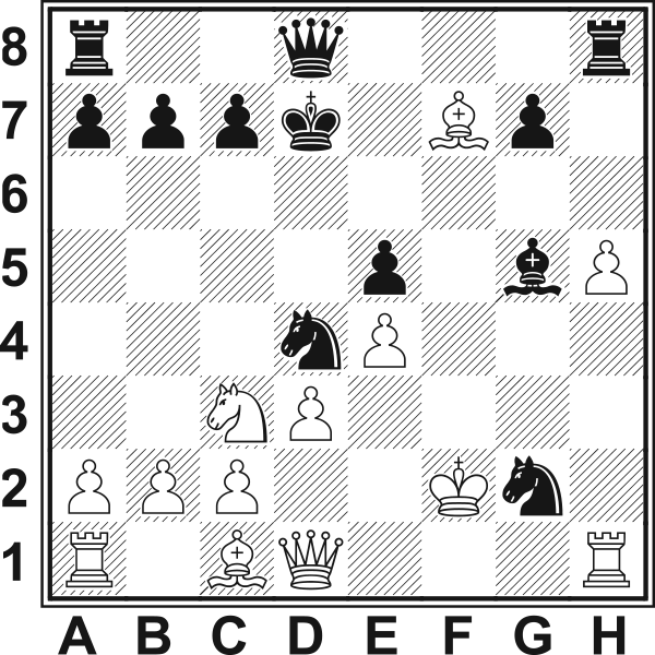 8.Gxd5? Błąd, po którym powstają korzystne dla czarnych komplikacje. Prawidłowe było 8.Sxd5! Sxh4 (lub 8...f6 9.Sf3 b5!? 10.Gf1) 9.d3!. 8...Gg4! 9.f3 Po 9.Gxf7+ Kd7 10.f3 Sxh4 11.d3 Sxg2+ 12.Kf1 Sf4 13.fxg4 Hxg5 czarne stały bardzo obiecująco. 9...Sxh4! 10.d3 Ge7! Przedwczesne było 10...Sxg2+? 11.Kf2 Sf4 12.Gxf4 exf4 13.Sxf7. Teraz pozycja stała się bardzo trudna dla białych. 11.Gxf7+ Po 11.Sxf7 Shxf3+ 12.gxf3 Gh4+ 13.Kd2 Hf6 czarne zachowywały silne groźby. 11...Kd7 Niedokładność. Przewagę zachowywało 11...Kf8!, np. 12.fxg4 Gxg5 13.0–0 Gxc1 14.Hxc1 hxg4 15.Gh5+ Sdf3+ 16.gxf3 g3 17.He3 (17.Gg4? Hd4+ 18.Kh1 Sf5+ z matem) 17...Wxh5 18.f4 Kg8 19.Hxg3 Hd4+ 20.Wf2 Wf8. 12.fxg4 Gxg5 13.gxh5! Losy partii zależą teraz od tego, czy białe zdążą wyskoczyć hetmanem na g4 z kontratakiem. 13...Sxg2+ 14.Kf2? Prawidłowe było 14.Kf1! Sf4 15.Gxf4 Gxf4 16.Hg4+ Kc6 17.Gb3 Wf8 18.Kg2 i pozycja białych stawała się nawet trochę lepsza.