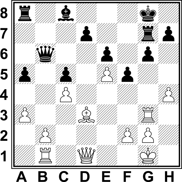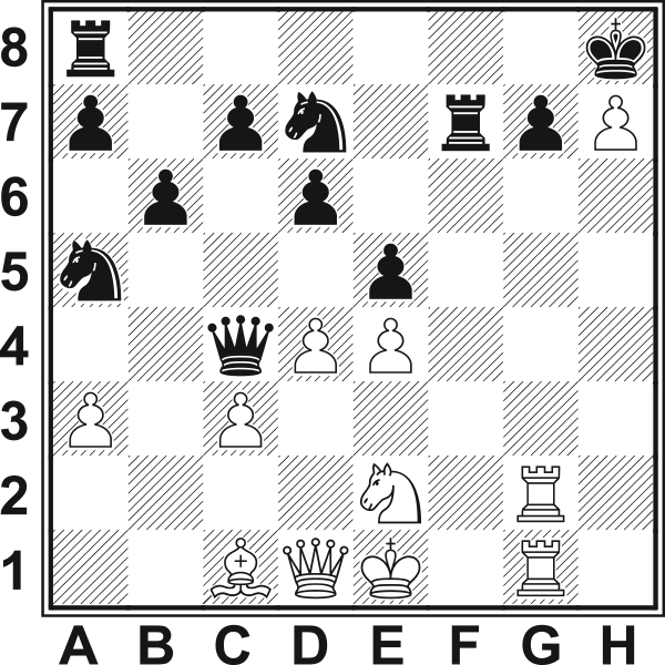 21.Gh6! gxh6 22.Wg8+ Kxh7 23.Wxa8 Sf6? Przegrywa prawie forsownie. Ostatnią szansę dawało 23...Hc6! 24.Wgg8 (24.Wxa7 Sf6) 24...Hxe4 25.Wh8+ Kg6 z trudną do oceny pozycją. 24.dxe5 Sxe4 Po 24...Hxe4 atak białych był też rozstrzygający: 25.exf6 Hxa8 26.Ha4 Kh8 27.Hh4 Hf8 28.Wg6 Kh7 29.He4 Kh8 30.Sf4 Wxf6 31.Hd4 itd. 25.Hc1! Grozi 26…Wh8+. 25...Sg526.Wxg5! Hh4+ Lub 26...hxg5 27.Hxg5 dxe5 28.Hh5+ Kg7 29.Wh8 z wygraną. 27.Wg3 Hh1+ 28.Wg1 Hxa8 29.Hc2+! Kh8 30.Hg6 Hf8 31.e6! We7 32.Wh1 Wh7 33.Wf1 Hd8 34.Wf7! Wxf7 35.exf7 Hf8 36.Hf6+ Kh7 37.Sf4 1-0