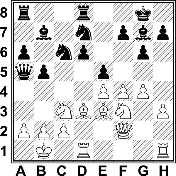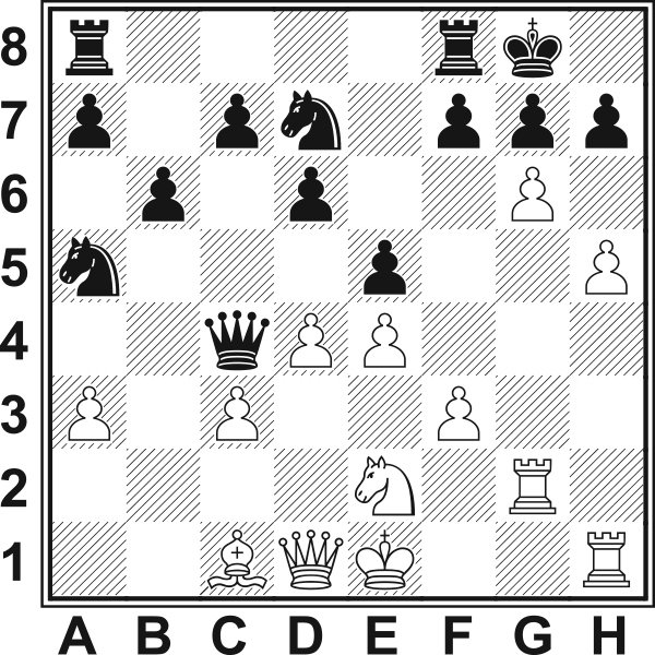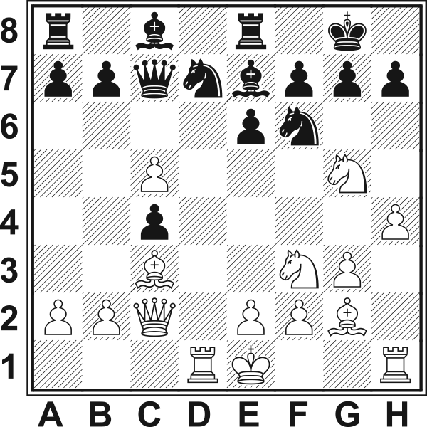 1.d4 Sf6 2.c4 e6 3.Sf3 d5 4.g3 Gb4+ 5.Gd2 Ge7 6.Gg2 0–0 7.Hc2 c6 8.h4 Sens tego posunięcia wydaje się wątpliwy, ale białe zdołały połączyć go z dalszym planem gry. 8…Sbd7 9.Sc3 Białe nie spieszą się z krótką roszadą, bo mają nadzieję na otwarcie linii „h”. 9...dxc4 10.Wd1 Sd5?! Pozwala białym przerzucić skoczka c3 do ataku na króla. Lepsze 10...b5 11.Sg5 Hb6. 11.Se4 c5?! Teraz atak białych rozwija się błyskawicznie. Należało zagrać 11...f5!? 12.Seg5 S7b6 13.Se5 Sb4 lub 11...h6!?, aby wkroczenie skoczka na g5 nie odbyło się bez kosztów. 12.Seg5! S5f6 (12...S7f6 13.e4) 13.Gc3 Hc7 14.dxc5 Grozi 15.Wxd7 z następnym Gxf6. 14...We8 (14...g6 15.h5)