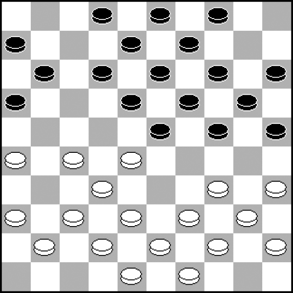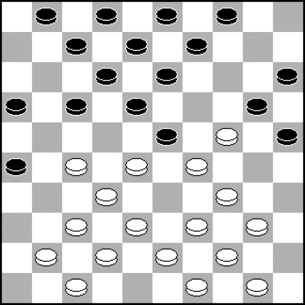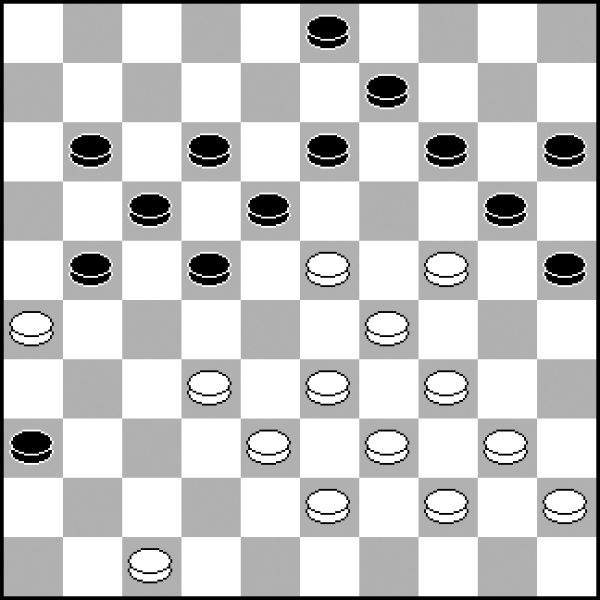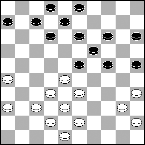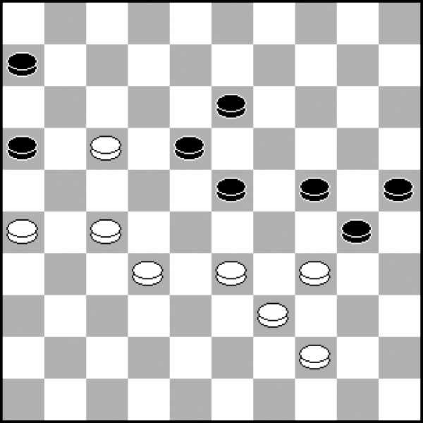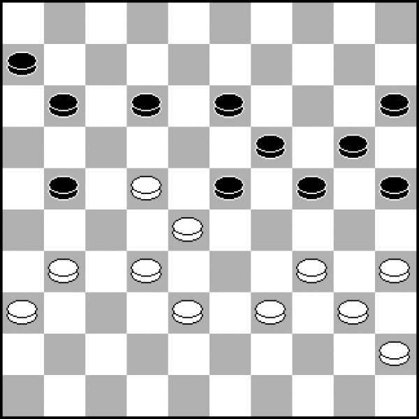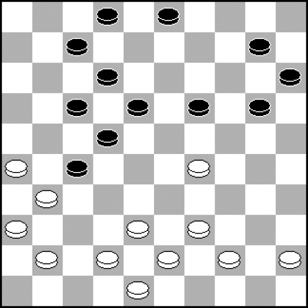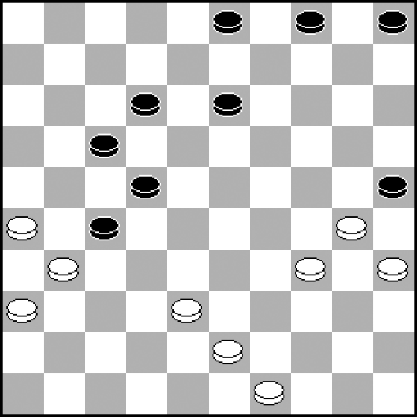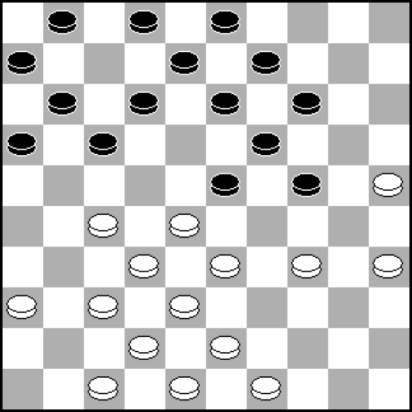 W tym układzie kamieni wyglądającym na standardową pozycję klasyczną dość niespodziewanie białe mogą zdobyć inicjatywę. Wykorzystują w tym celu motywy kombinacyjne, które łatwo przeoczyć! 1.27-22! 18x27 2.32x21 23x32 (2...16x27? 3.34-29! 24x22 4.35-30 25x34 5.40x16 i pion 27 ginie) 3.37x28 16x27 4.28-23 19x28 5.34-30 25x34 6.39x10 9-14 7.10x19 13x24 8.41-37 12-17 9.37-32 28x37 10.42x22 17x28 11.40-34 i czarnym niełatwo będzie obronić punkty 24 i 28.