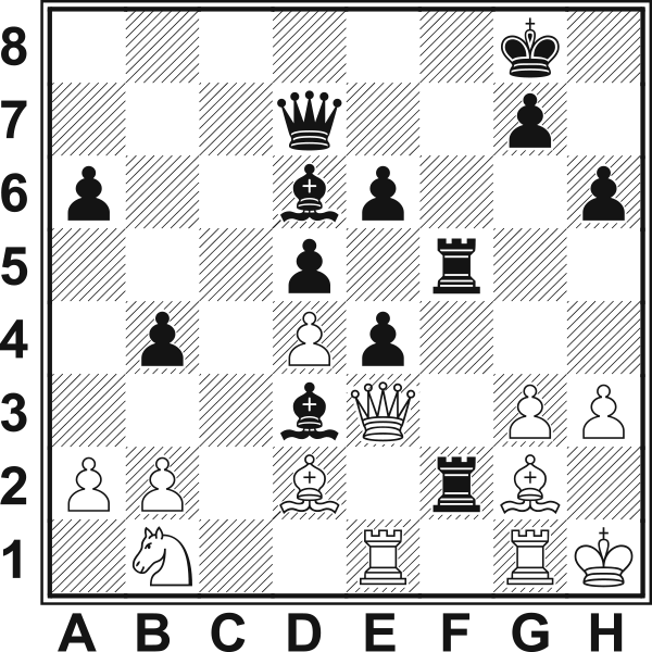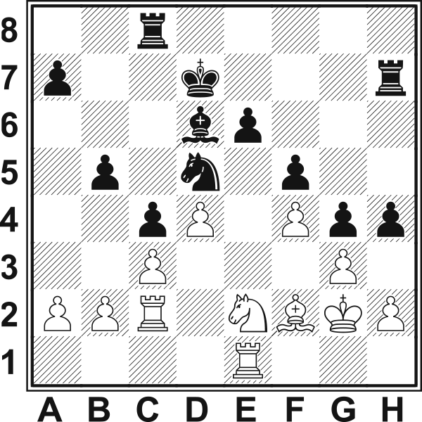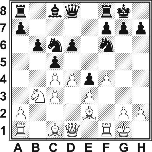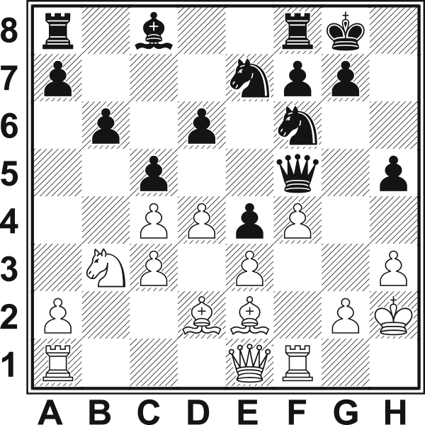 12...Hd7!! Wstęp do bardzo oryginalnego i skomplikowanego manewru mającego na celu zatrzymanie marszu białych pionków. 13.h3? Osłabia pole g3 i traci czas. 13...Se7 14.He1?! Znowu strata tempa. W dodatku umożliwia czarnym zastosowanie blokady. 14.g4 h5 15.f5 (15.g5 Hh3 16.gf6 Hg3+ 17.Kh1 Sf5) 15...g6 14...h5! 15.Gd2 Lub 15.Hh4 Sf5 16.Hg5? Sh7 17.Hh5 Sg3–+ 15...Hf5! 16.Kh2