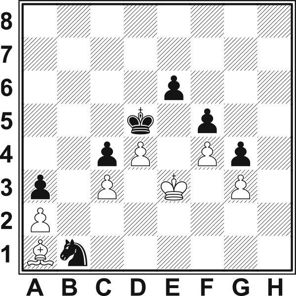 Trudno sobie wyobrazić lepszą pozycję dla czarnych, ale trzeba jeszcze zrealizować przewagę. A jak zobaczymy, nie jest to łatwe. 33.Wa1 hg3?! Otwarcie pozycji na drugim skrzydle nie współgra z ideą blokady. 34.hg3 a5 35.Wcc1? Wymiana wież tylko pomaga czarnym. Pewne szanse zachowywało 35.a4 b4 36.cb4 Sb4 37.Wc3 Sd5 38.Wc2 Wb8. 35...Wch8 36.Wh1 Zdecydowanie lepsze było 36.Gg1, bo nie dopuszczało do wymiany wież. 36...Wh1 37.Wh1 Wh1 38.Kh1 b4 39.Kg2 a4?! W prosty sposób wygrywało 39...Kc6 40.Kf1 Kb5 41.Ke1 b3 42.ab3 cb3 43.Kd2 Kc4. 40.cb4 Gb4 41.Kf1 Kc6 42.Ge1! Kb5 Białe liczyły na wariant 42...Se3+ 43.Kf2 Sd1+ 44.Kf1 Ge1 45.Ke1 Sb2 46.Sc3. 43.Sc3+ Przegrywała także wymiana gońca 43.Gb4 Kb4 44.Ke1 c3 45.bc3+ Sc3. 43...Gc3 44.bc3 Kc6 45.Ke2 Sf6 46.Ke3 Se4 47.Ke2 Kd5 48.Ke3 Kd6 To tzw. manewr trójkąta, w którym poprzez stratę tempa przekazuje się posunięcie przeciwnikowi i tym samym traci on pozycję obronną. W tym przypadku pozwala czarnym przeniknąć do przeciwnego obozu. 49.Ke2 Kc6 50.Ke3 Kd5 51.Ke2 Sd6 52.Ke3 Sb5 53.Gd2 Sa3 54.Gc1 Wymuszone, gdyż przegrywa 54.Ge1 Sc2+ 55.Ke2 Se1 56.Ke1 Ke4 57.Ke2 a3. 54...Sb1 55.Gb2 a3 56.Ga1