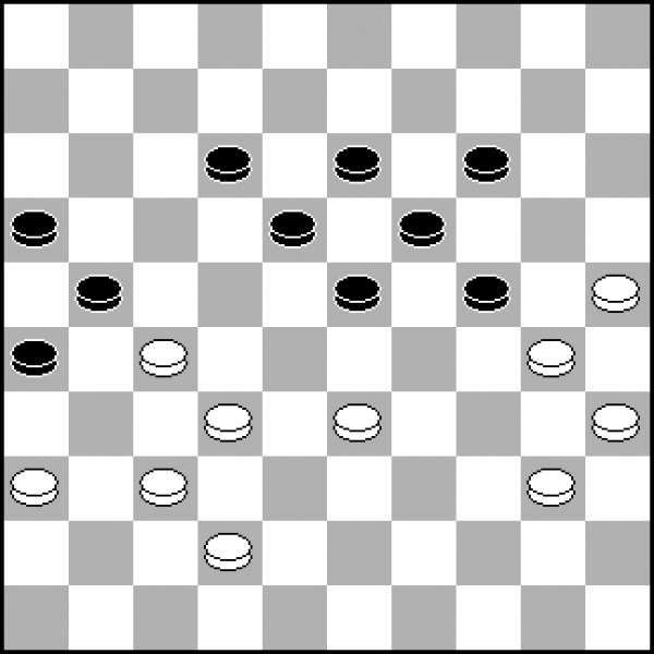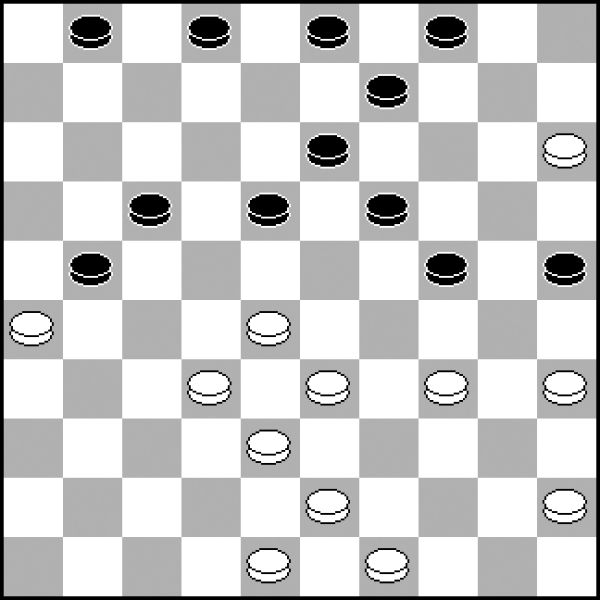 Czarne zbudowały podkowę (21, 17, 18, 19, 24), chcąc podchwycić białego piona 28. To czas, by odrzucić je do tyłu i przejąć białymi kontrolę nad centrum i punktem 24. 1.34-29! 18-22 2.29x20 25x14 3.35-30! Koniec podchwycenia, czas na atak! 3...1-6 4.45-40! Pion 45, stając na 29, będzie nie do ruszenia dla przeciwnika. 4...13-18 5.40-34 6-11 6.34-2 11-16 7.30-25 9-13 8.43-39 3-9 9.49-44 22-27 10.44-40 18-23 10...17-22? 11.26x17 22x11 12.32x21 16x27 13.28-23 19x28 14.33x31 z pionem zysku. 11.29x18 13x22 12.39-34 2-8 13.34-29 8-13 14.40-35 13-18