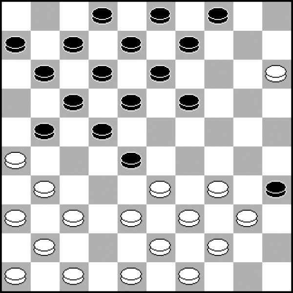 W niemałe tarapaty wpadłem już w pierwszej rundzie mistrzostw, kiedy to byłem rozstawiony. W widocznej pozycji skończyły mi się dobre opcje, pozostało szukać remisu. A ten można uratować nawet z pionem mniej − nie można się poddawać! 1.40-35 29-33 2.38x29 12-18 3.35x24 18x47 4.29-23 47x20 5.15x24 8-12 6.23-19 21-26 7.19x8 12x3 8.24-19 i powstała pozycja jest remisowa, zachęcam do samodzielnego sprawdzenia.